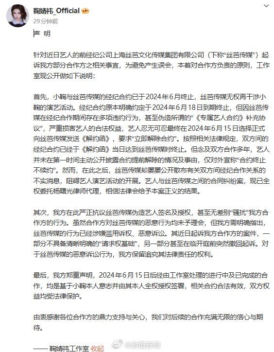 最后,我方郑重声明,2024年6月15日后经由工作室处理的进行中及已完成的合作,均是基于小鞠本人意志并由其本人全权授权签署,相关合约合法有效,双方权益均受法律保护。由衷感谢各位合作方的鼎力支持与关心,我们对后续的合作充满无限的信心与期待。 #鞠婧祎[超话]#