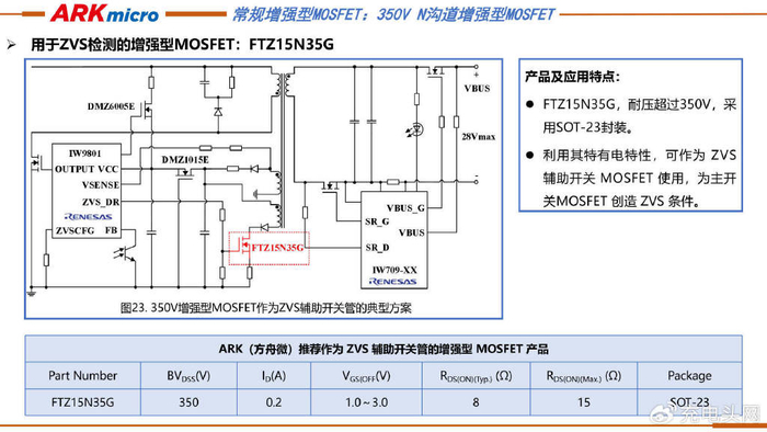 ARK(方舟微)还推出FTZ15N35G增强型MOSFET,其耐压超350V,采用SOT-23 封装,可作为ZVS 辅助开关MOSFET,为ZVS创造条件,在瑞萨快充方案中可实际用作ZVS辅助开关管使用。
