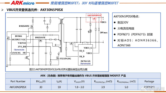 ARK(方舟微)推出的增强型N沟道MOSFET产品AKF30N5P0SX,其具有耐压30V、大电流低电阻、PDFN3*3封装等特点。作为VBUS开关管的优选器件,该产品在典型应用方案中可与 瑞萨DMZ6005E、IW9801等元件配合使用,对标竞品AONR36366、AON7566。