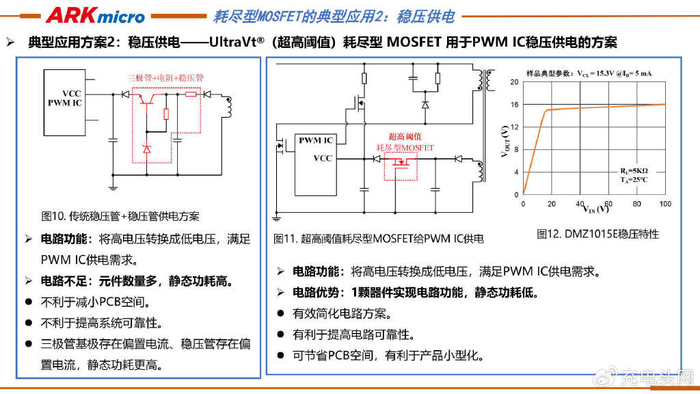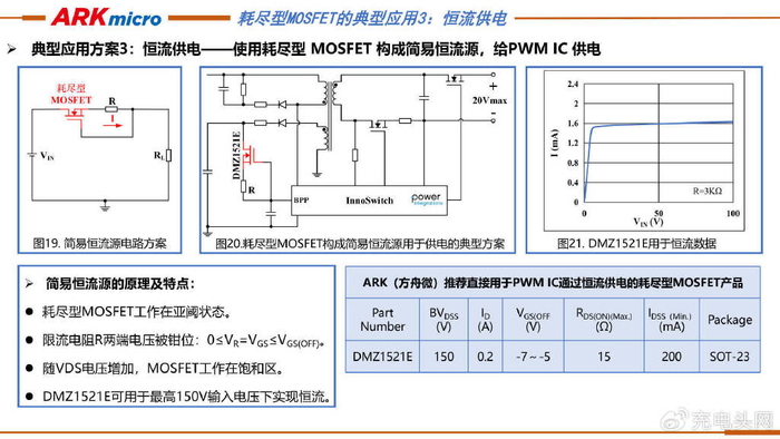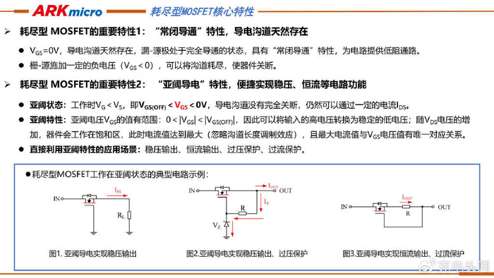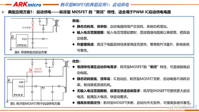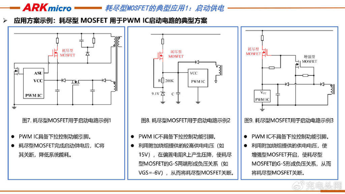 ARK(方舟微)提出了耗尽型MOSFET在启动供电电路中的三种应用示例。示例一中PWM IC有下拉控制功能引脚,耗尽型MOSFET启动后被IC下拉关断以节能;示例二中PWM IC无下拉引脚时,靠偏置电阻压降使耗尽型MOSFET门源负压关断;示例三中PWM IC同样无无下拉引脚,利用增强型MOSFET开启产生的压降,使耗尽型MOSFET门源负压关断。