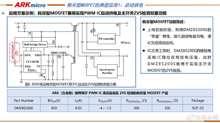 ARK(方舟微)850V高压耗尽型MOSFET可用于IC启动及ZVS检测的典型方案。DMZ85200E耗尽型MOSFET在上电初始阶段利用其“常通”特性为IC启动电容充电,实现高压启动;IC正常工作时,其栅极电压被IC箝位,用于主开关MOSFET ZVS检测。