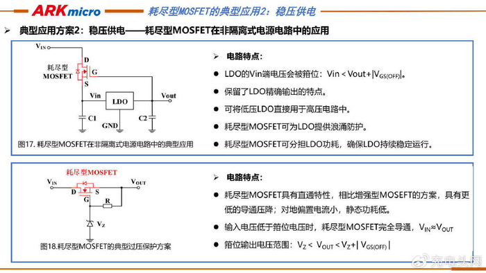 耗尽型MOSFET在非隔离式电源电路中的典型应用主要分为两个部分,其一是非隔离式电源电路中的典型应用,具有对LDO端电压箝位、保留LDO精确输出特点,可将低压LDO用于高压电路、为LDO提供浪涌防护以及分担LDO功耗确保稳定运行等特点;其二是典型过压保护方案,其具有直通特性,相比增强型MOSFET方案导通压降低、偏置电流小、静态功耗低,且在输入电压低于箝位电压时完全导通,输出电压在一定范围内。