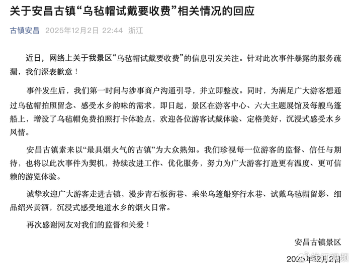 12月2日晚间,“古镇安昌”微信公众号发布关于安昌古镇“乌毡帽试戴要收费”相关情况的回应。