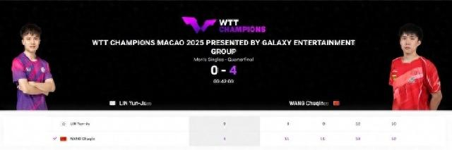 直播吧09月13日讯 WTT中国澳门冠军赛男单1/4决赛,王楚钦4-0战胜林昀儒,率先晋级男单四强。