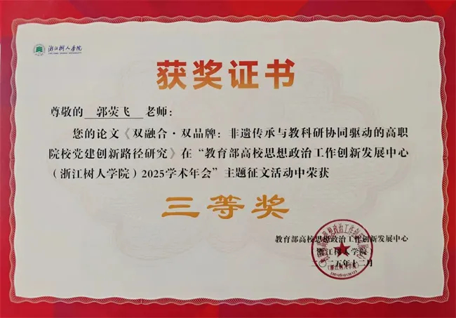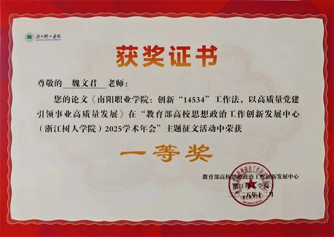 会议还对年度优秀主题征文进行了表彰。南阳职业学院共有两篇文章获奖,其中党委书记魏文君的《南阳职业学院:创新“14534”工作法,以高质量党建引领事业高质量发展》获一等奖,公共教学部主任郭荧飞的《双融合·双品牌:非遗传承与教科研协同驱动的高职院校党建创新路径研究》获三等奖,充分展现了该校在党建与思想政治教育领域的理论思考深度与实践创新成果。