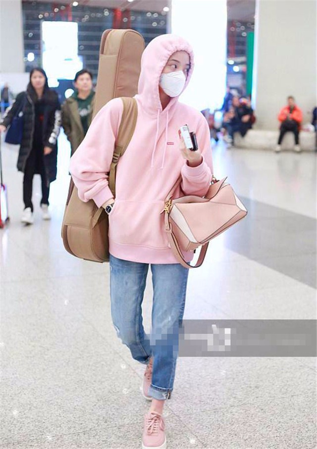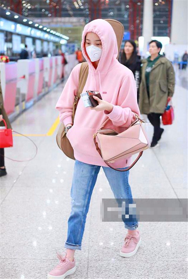 欧阳娜娜身穿粉色连帽卫衣现身机场,网友:穿这么少不冷吗?