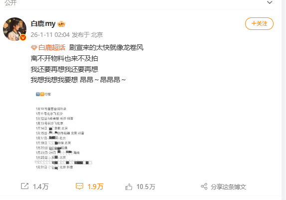 【#白鹿微博状态改为等佩仪中#】#白鹿粉丝呼吁合理规划行程# 1月11日,@白鹿my 深夜发布1月工作行程,并表示“剧宣来的太快就像龙卷风”,还在评论区留言,“守护这个李佩仪”,将微博状态改为“等佩仪中”。其“魔鬼行程”强度也引发健康担忧,有粉丝呼吁团队合理规划行程。
