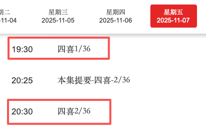 此前,CCTV8的节目单显示:11月7日晚7点半的电视剧为《爱情没有神话》。图据澎湃新闻但11月4日,该档期电视剧已经改变为由童瑶、蒋欣、黄明昊主演的女性成长剧《四喜》。
