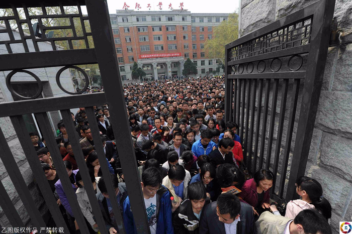图为2012年,安徽合肥考点,结束考试后,考生如潮水一般涌出考点。