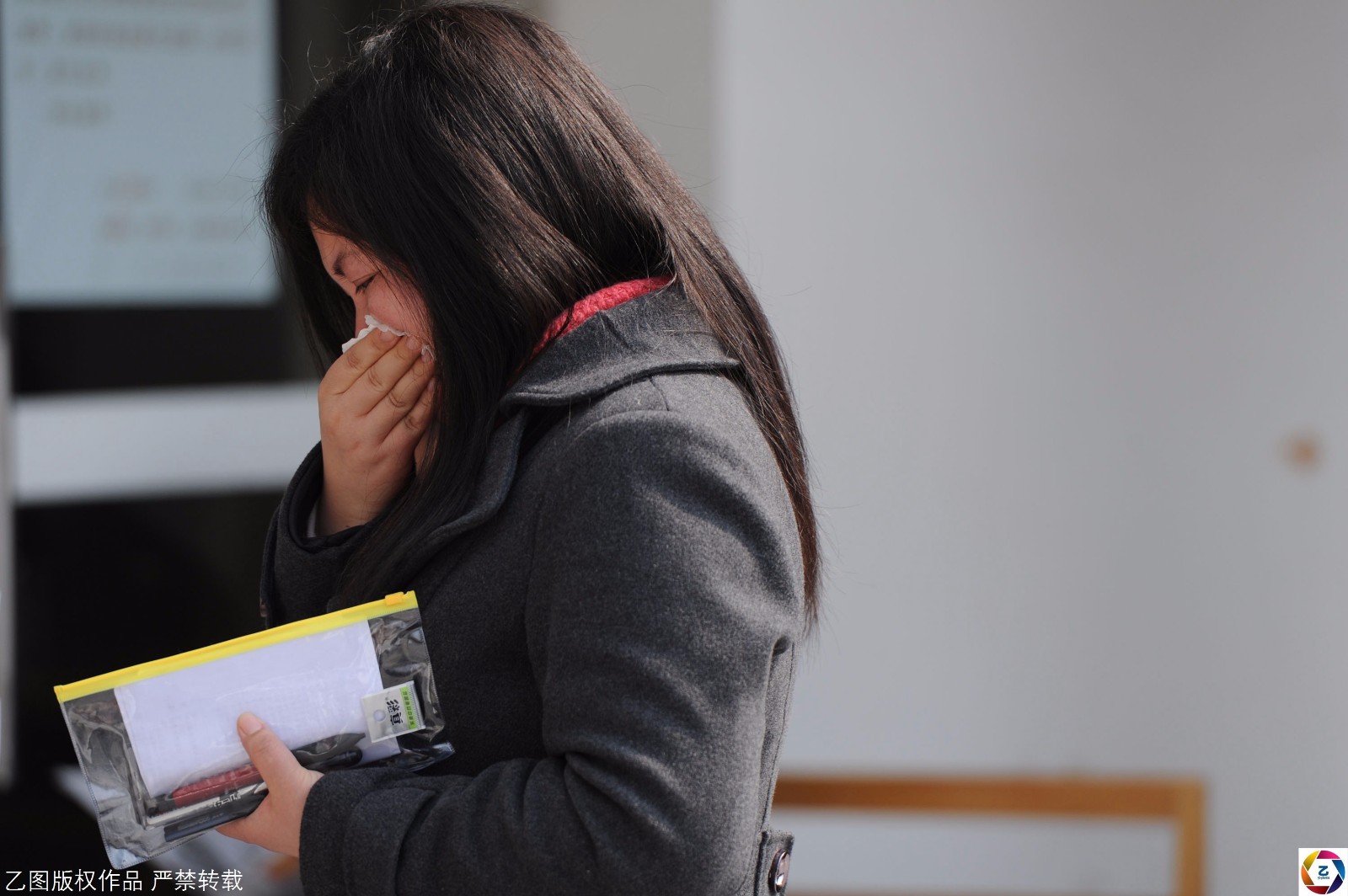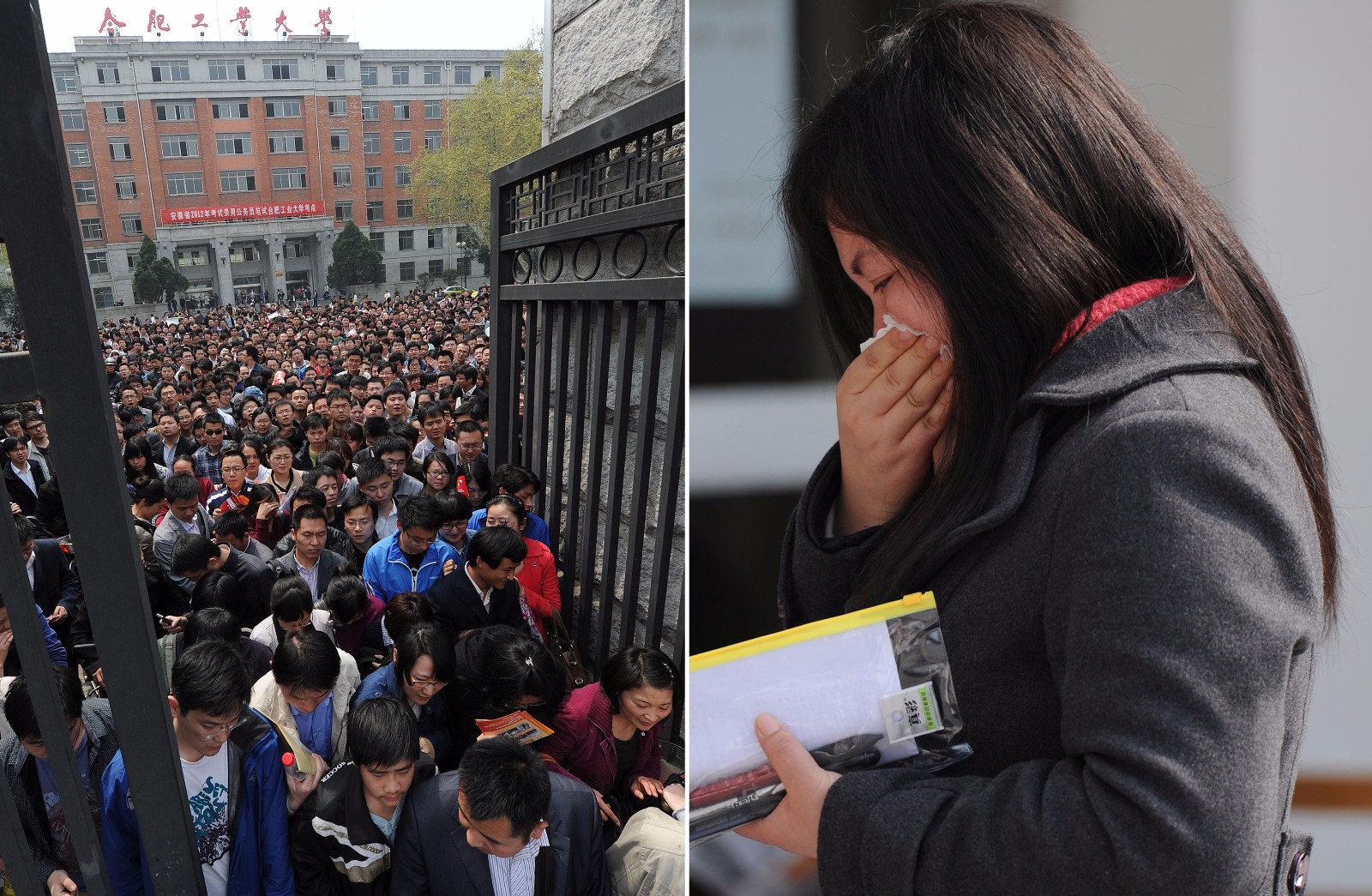 图为2011年,安徽合肥考点,一名考生因为迟到被拒绝进入考场,在一旁哭泣。