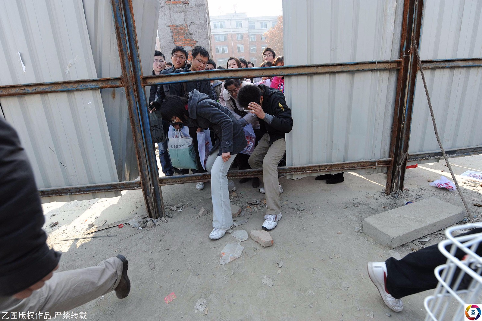 图为2010年,安徽合肥考点,因为人太多,考生结束上午考试后,通过一个围栏缝隙钻出。