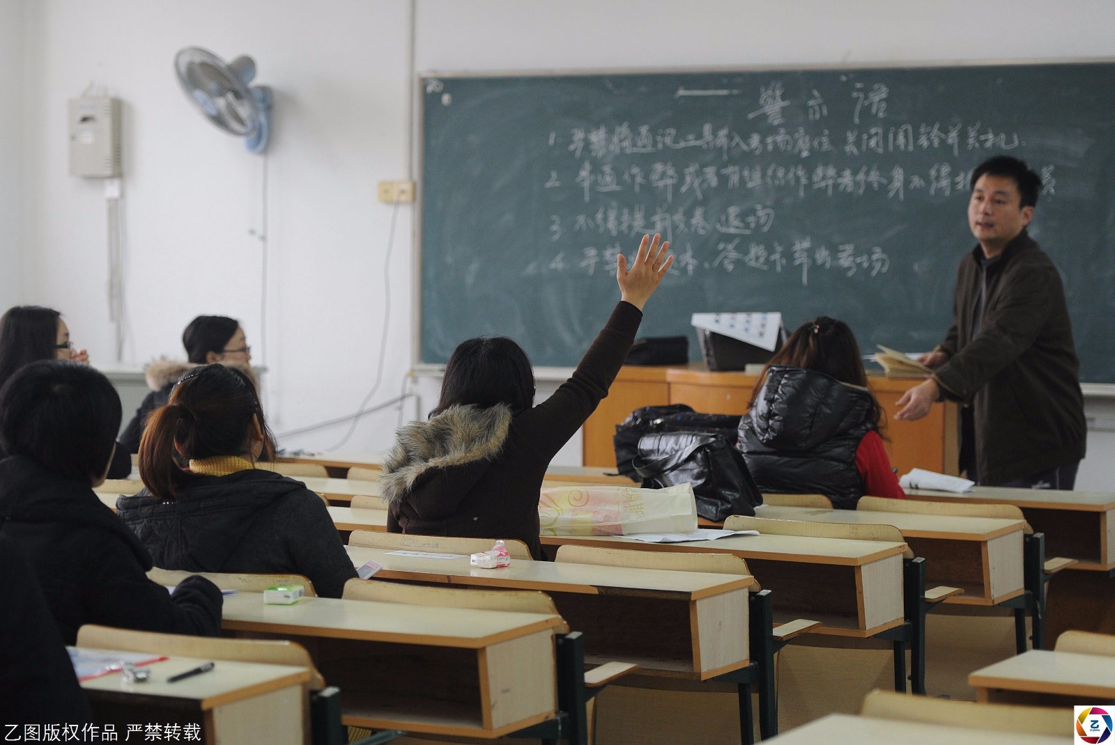 图为2011年,安徽合肥考点,考场一名考生举手询问监考老师问题。