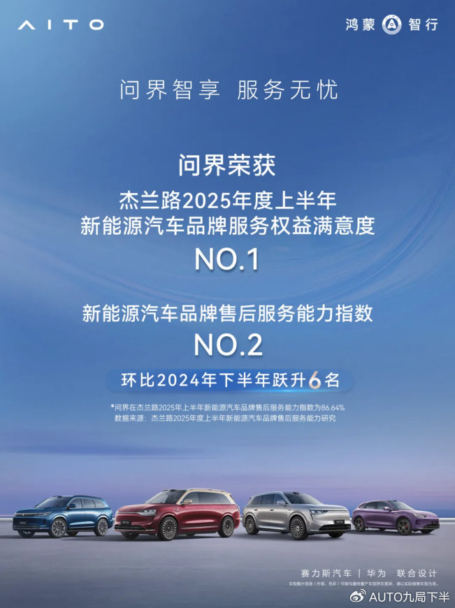 正是硬核技术实力与极致服务,让问界获得了用户真正的认可。根据杰兰路发布的《2025年度上半年新能源汽车品牌健康度研究》结果,问界荣获品牌服务权益满意度第一名、品牌售后服务能力指数第二名的好成绩;同时,问界M9在新能源车型净推荐值(NPS)总榜中取得85.2分的高分表现,位居领先位置。