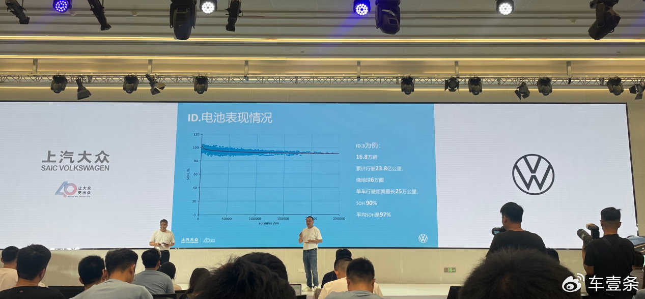 此外,在产品解析会上,上汽大众还公布了已售出16.8万辆ID.3的电池表现情况。数据显示,ID.3最长行驶里程为25万公里,其电池SOH(State of Health,电池健康状态)为90%;所有售出ID.3的平均SOH则为97%,这意味着ID.3的电池衰减很小。