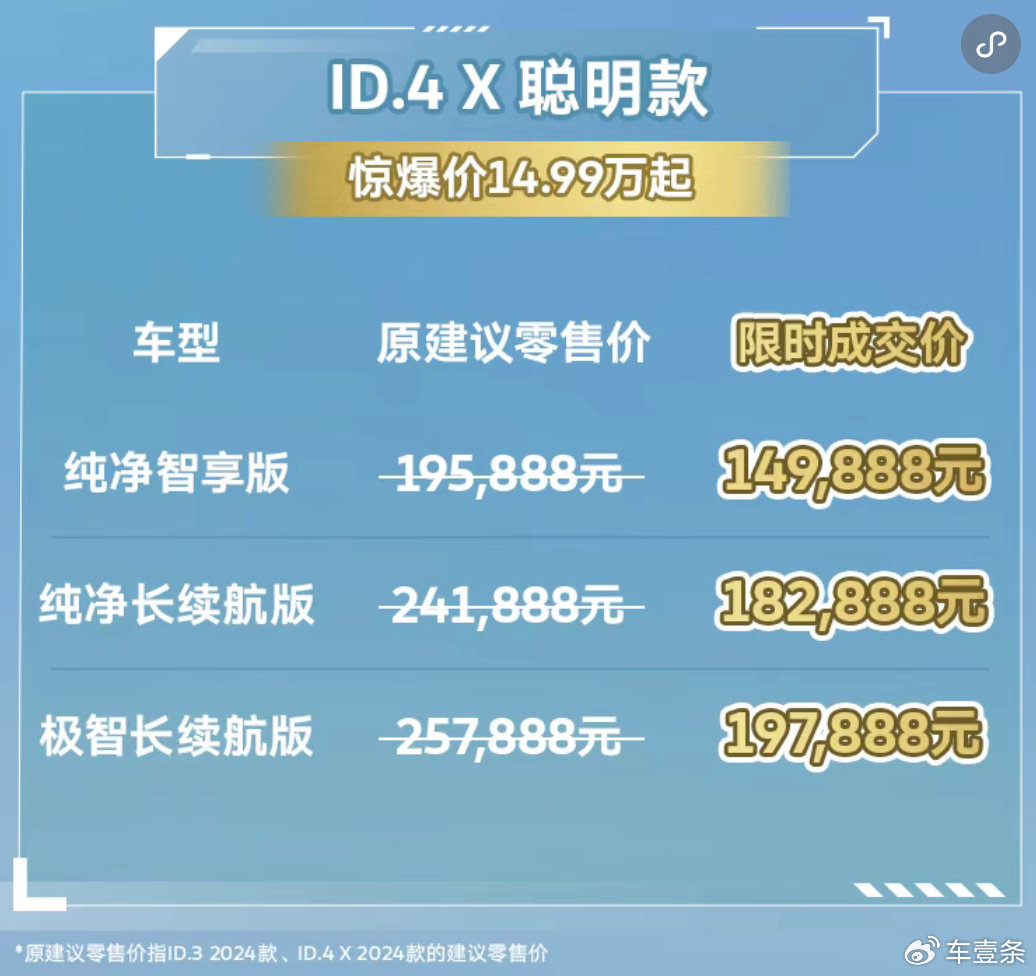 8月1日,上汽大众在上海举办产品解析会,进一步解释这两款车的“聪明之处”。而在定价上,上汽大众延续了之前的低价策略,相比原建议零售价,ID.3全系优惠4.4万元,比2024款车型的3.8万元优惠要更大。新款ID.3起售价首次降低至12万元以下,为11.99万元。ID.4 X起售价为14.99万元,顶配车型降价6万元。
