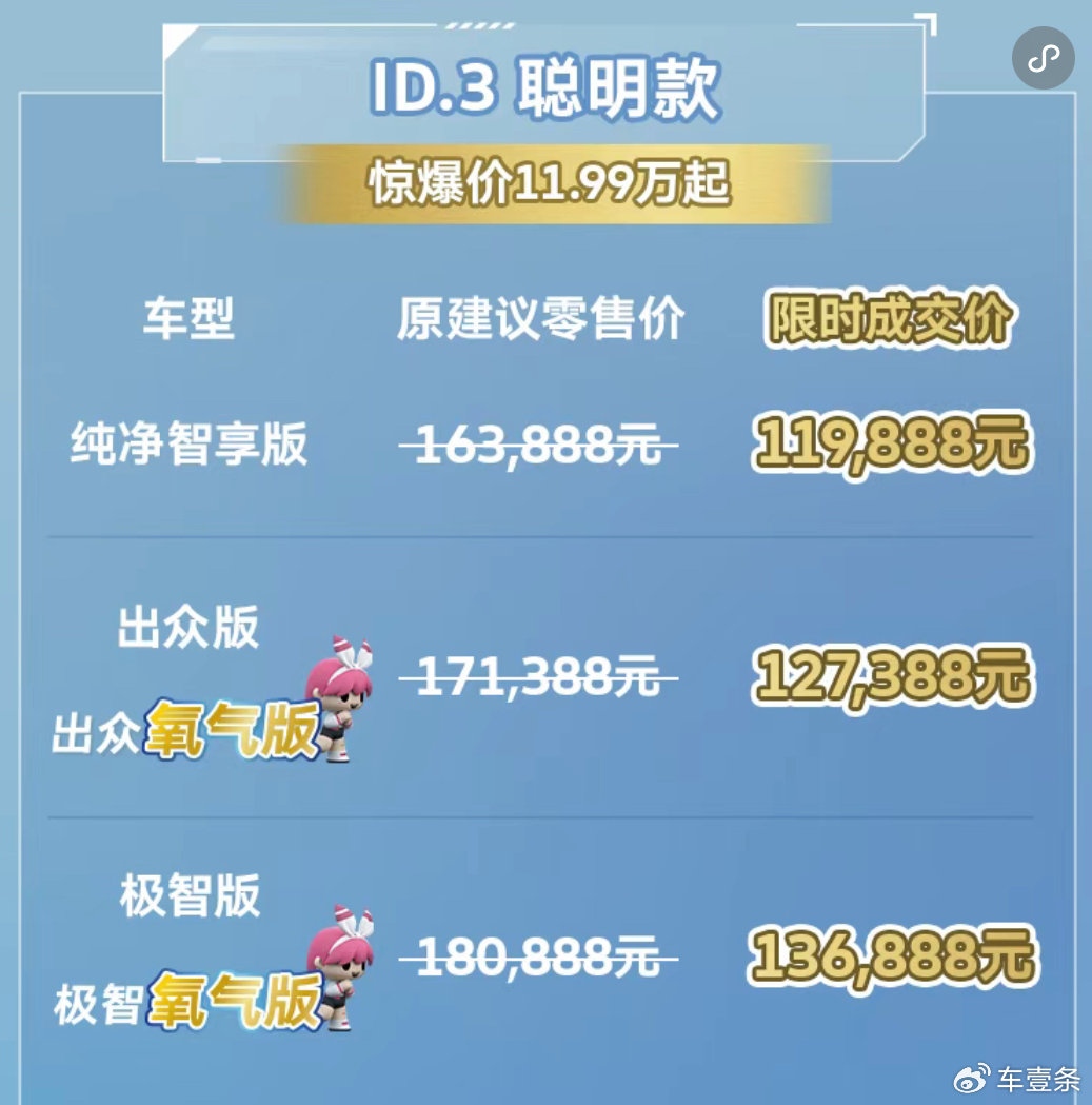 配置升级的同时,ID.3的起售价进一步下探,这彰显了上汽大众在定价上的务实态度。去年7月份,上汽大众首次降低了ID.3的指导价,当时最高降幅为3.7万元。