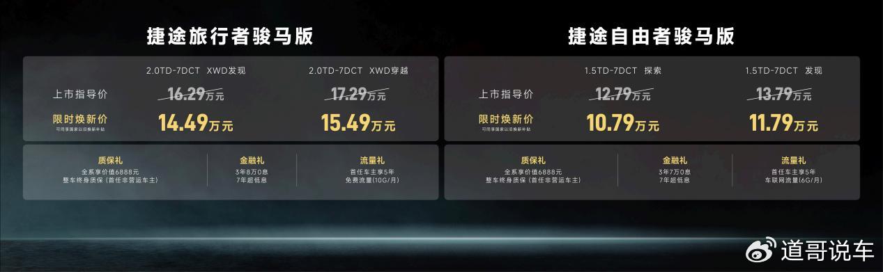 先看价格,这是最硬核的诚意。捷途旅行者骏马版推出了两个版型,官方指导价16.29万元到17.29万元,但上市期间给了三重权益,限时焕新价直接拉到了14.49万元到15.49万元。捷途自由者(配置|询价)骏马版更是把门槛往下压了一大截,两个版型官方指导价12.79万元到13.79万元,限时焕新价只要10.79万元到11.79万元。这个价位段,放在方盒子越野这个细分市场里,确实是冲着让更多人“买得起、玩得起”去的。