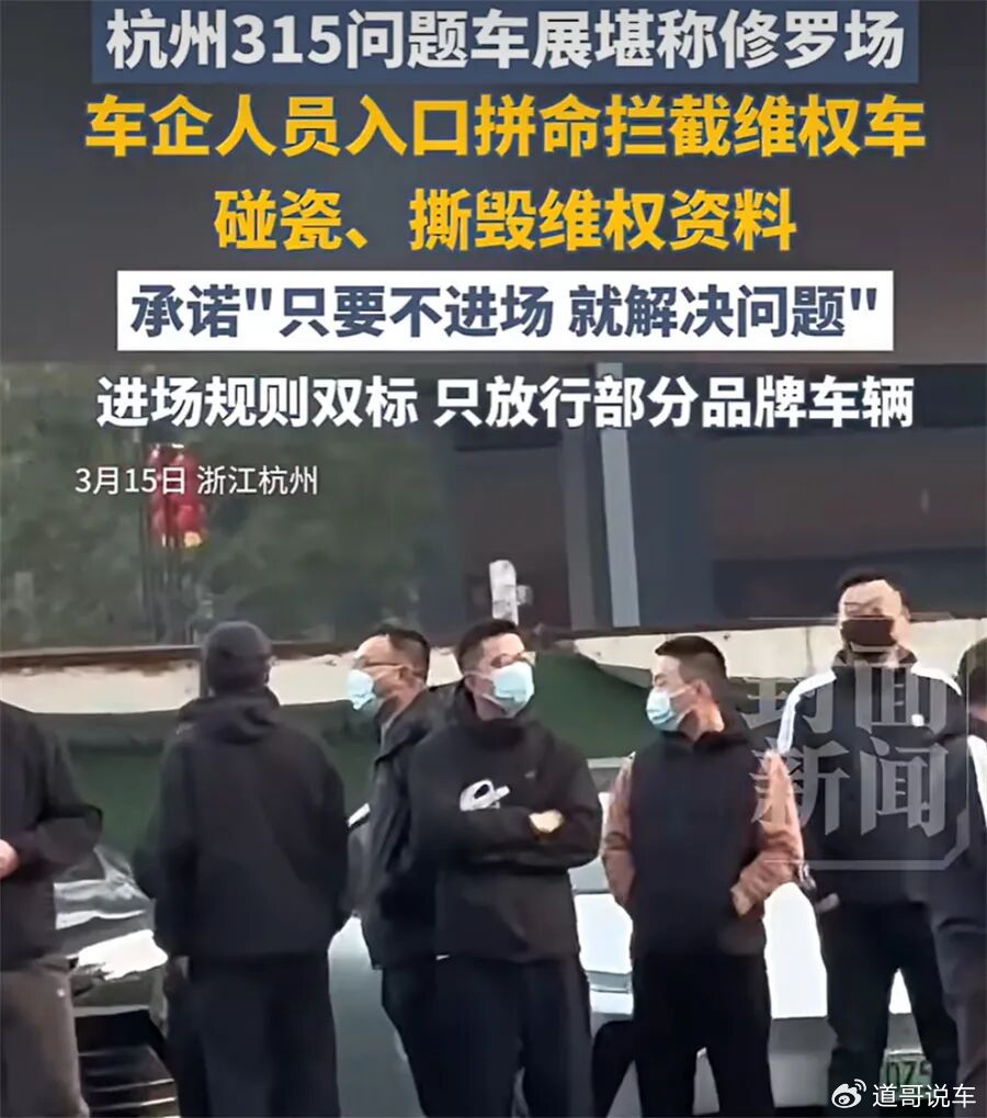 有评论说,今年的315“只有鸡爪背了锅”。这话虽然调侃,却也戳中了一个事实:当大品牌从315彻底消失,当曝光名单里只剩下那些一眼假的老套路,消费者还能指望谁来守护自己的权益?广州杭州问题车展上的那些黑衣人、美女挡路、蒙车衣的骚操作,难道不正是汽车行业需要被敲打的证据吗?