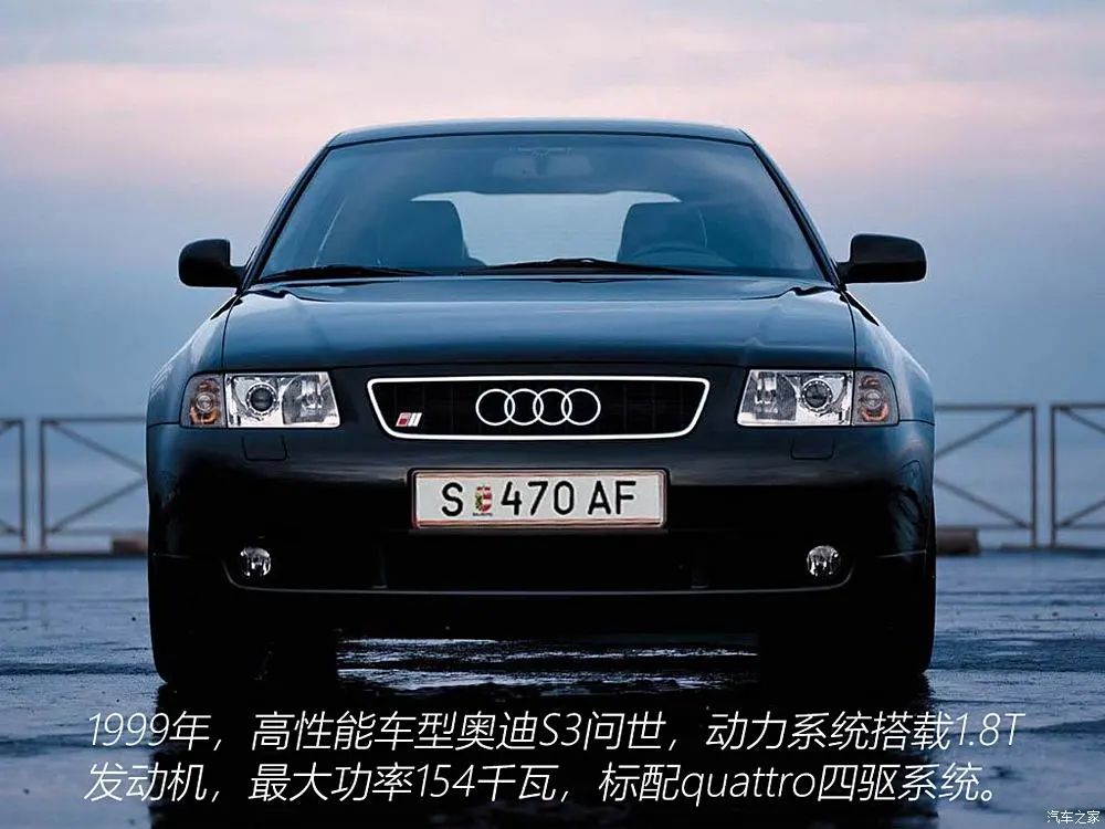 1999年,为了满足消费者对更高性能的需求,第一代奥迪A3还推出了高性能车型——S3。奥迪S3搭载了最大功率154千瓦的1.8T发动机,标配四驱系统。S3在外观上与普通版有所区别,如17寸“Avus”合金大轮毂、换装225/45 R17的宽胎以及银色涂装的后视镜等,进一步提升了车辆的运动性能和视觉效果。