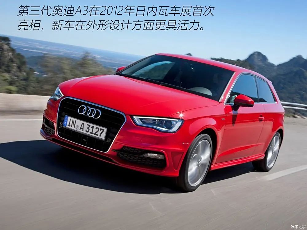 2012年日内瓦车展,第三代奥迪A3首次亮相。相比上代车型,第三代奥迪A3在外形设计方面更具活力,全新家族式的多边形进气格栅以及有棱有角的前大灯让它看上去十分年轻,侧面线条也一气呵成,整体感很强。第三代奥迪A3车身使用轻量化热成型钢和大量铝制材料,轻量化科技的应用使其相比上代车型减重70-120kg。