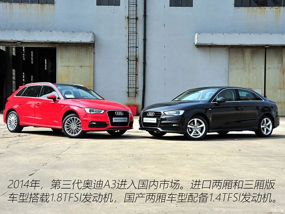 2014年3月,第三代奥迪A3与国内消费者见面,先期推出的车型包括1.8TFSI的进口两厢和三厢版,以及1.4TFSI的国产两厢车型,其中进口全新A3的售价区间为26.98-33.43万元,国产车型为19.99-28.67万元。两种车身结构选择迎合了中国消费者对于“三厢”的喜爱,而三厢版的短尾造型,加上后备厢盖末端上翘式设计,突显了整车的运动气质。