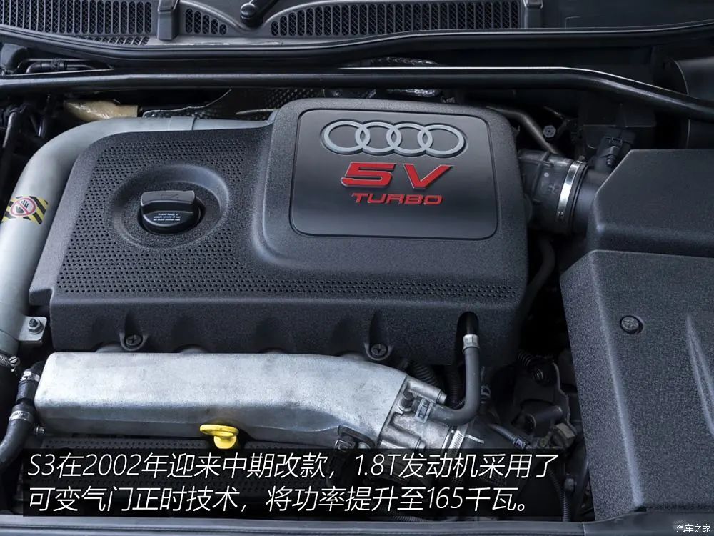 2002年,S3迎来中期改款,更新了前翼子板、后灯组、一体化前大灯和指示灯单元,并对内饰饰件进行了小幅升级。1.8T发动机采用了可变气门正时技术,将功率提升至165千瓦。标准配置包括带高压清洗器和自动调平功能的氙气HID前大灯、前雾灯、电动调节的Recaro真皮座椅、气候控制等。可选配置包括Bose音响、6碟CD、金属漆、18英寸9辐RSTT轮毂、天窗、隐私玻璃(从B柱向后)、自动防眩目后视镜、泊车辅助、前排座椅加热、巡航控制、铝制车门后视镜外壳以及部分皮革/Alcantara(蓝色/银色/黄色)组合座椅套等。