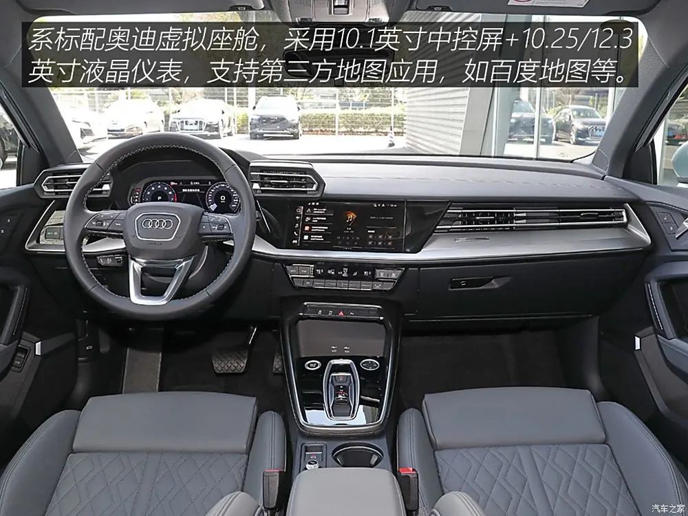 内饰部分,全新奥迪A3的中控台由高低错落、层次鲜明的线条勾勒,极具现代工业美感。10.25英寸全液晶仪表盘(高配12.3英寸)+10.1英寸中控触屏,提升了内饰的科技氛围,配备最新的MMI信息娱乐系统,支持CarPlay、安卓Auto等互联功能。同时,空调、车辆设置等依然保留物理按键,实现了科技体验与便捷操作的良好平衡。全新奥迪A3还是奥迪家族首款搭载全新电子换挡杆的车型,这一设计使得中控台下方空间更为宽敞。