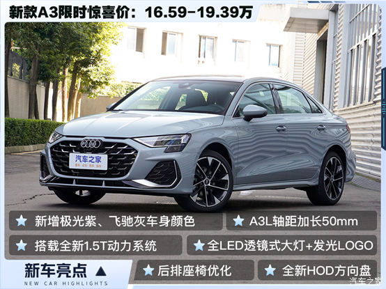 2024年11月,奥迪A3推出中期改款车型,共4款车型,限时惊喜价区间为16.59-19.39万元。新款奥迪A3全系换装EA211 evo 1.5T涡轮增压发动机,并在外观、内饰、配置上迎来多项升级。