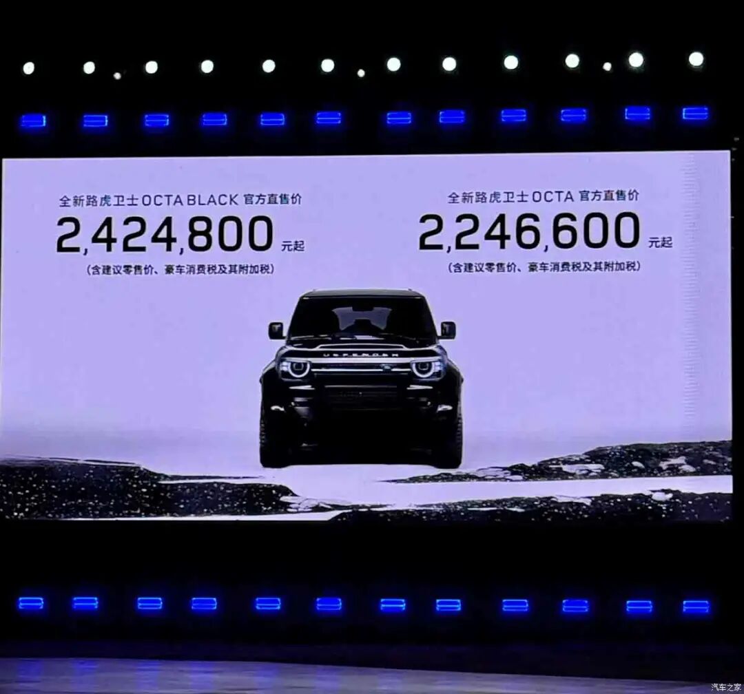 9月25日,路虎卫士(配置|询价)OCTA正式上市,共推出2款车型,厂商建议零售价为199.9万-215.8万元,官方直售价(含建议零售价、豪车消费税及其附加税)区间为224.66万-242.48万元。该车可以看作是卫士的高性能版车型,其将会搭载4.4T V8轻混动力系统,最大功率635马力,0-100km/h加速时间仅需4秒。