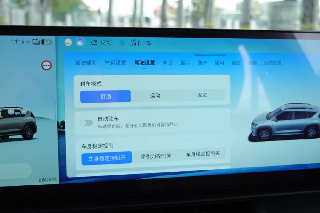 EO羿欧的加速、刹车、转向调校都非常线性,特别是制动系统,它提供“舒适”、“运动”和“家庭”几种模式,在“舒适”模式下,制动踏板初段存在一定虚位,继续深踩能够建立充足的制动力;“运动”模式下制动力释放更加迅速,初段虚位也更小;“家庭”模式可以理解为“舒适+”,对比“舒适”模式,它的虚位更大,尽量避免刹车点头现象的发生。