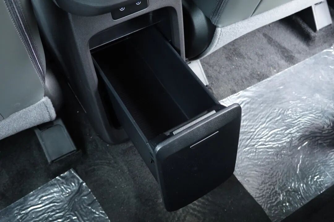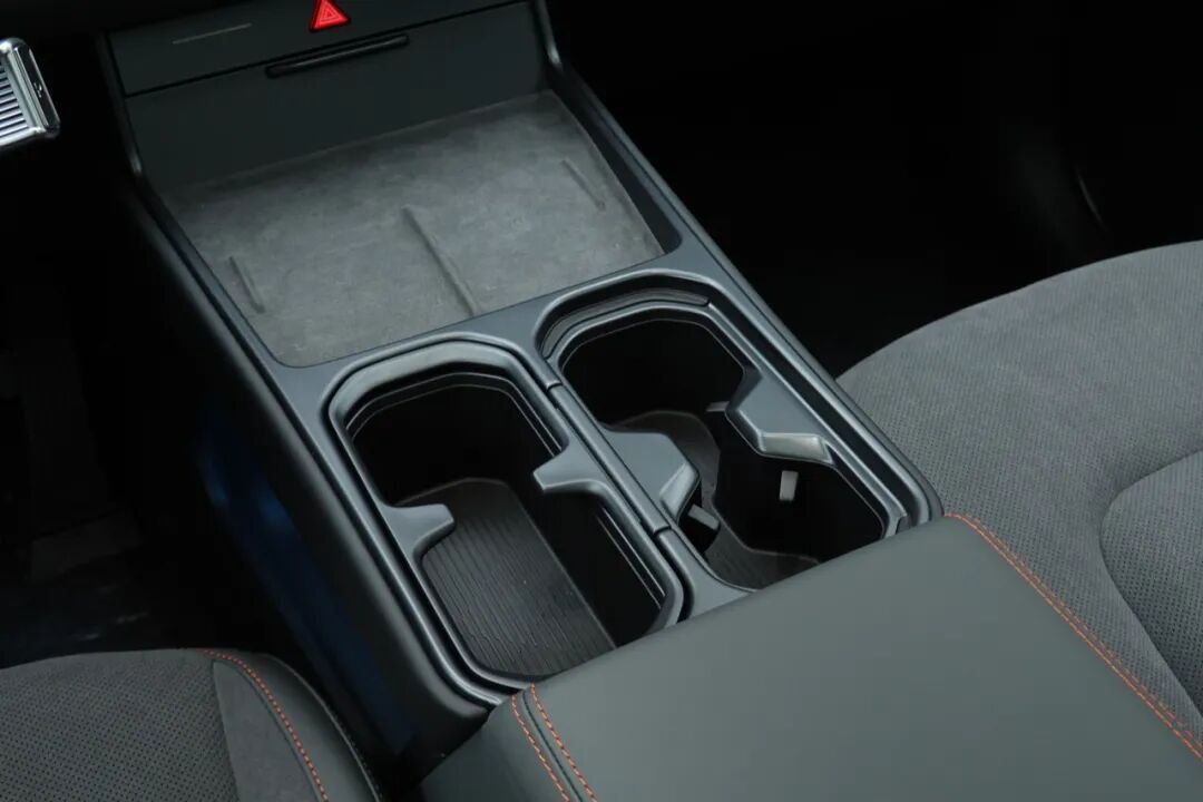 大屏下方巧妙的设计了储物槽,钱包、手机都可以放入其中。中岛区域的水杯架也有巧思,能够根据实际用途在储物格和水杯架之间自由切换。前方是双手机无线充电面板,可以根据需求开闭。