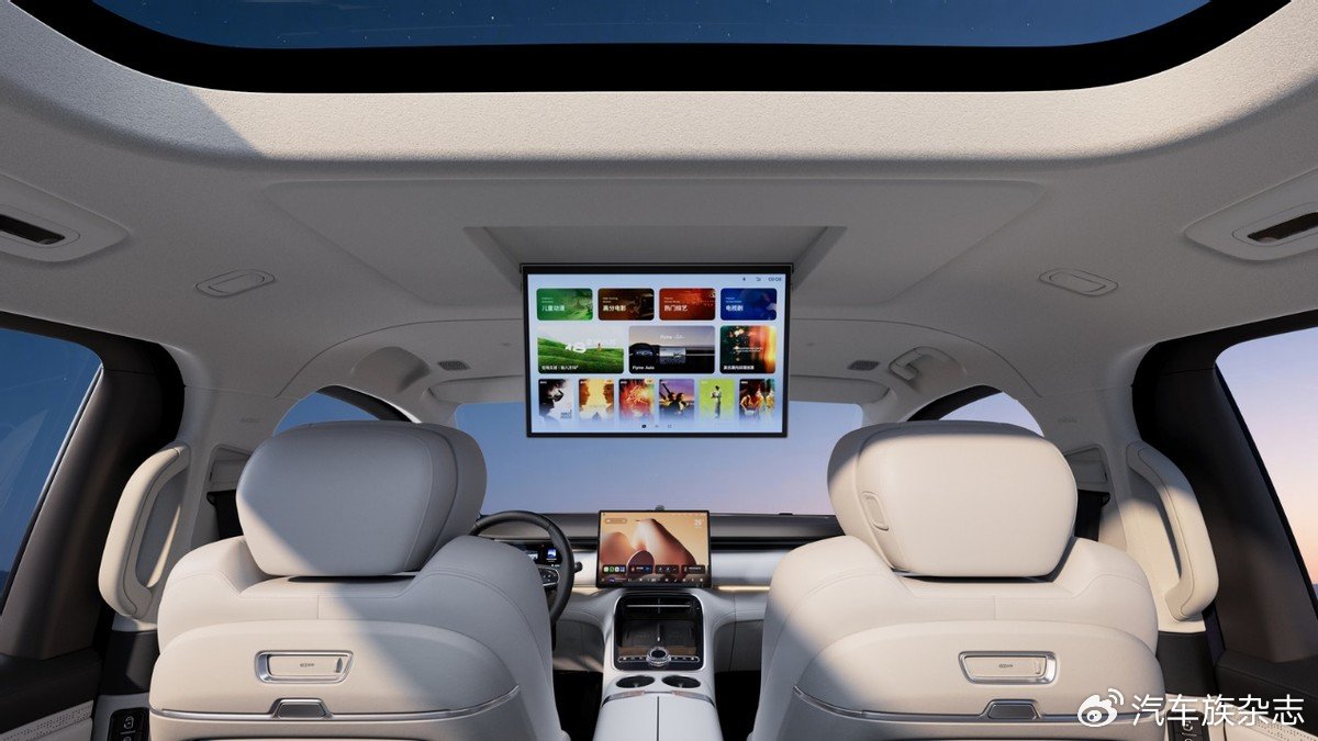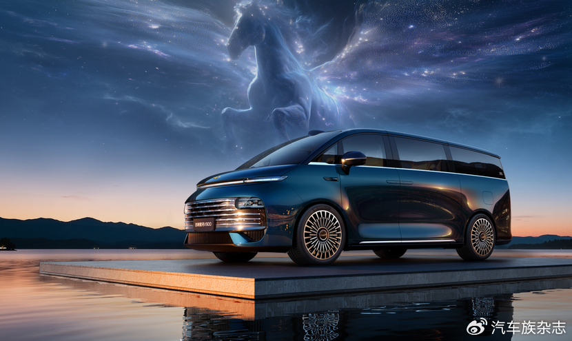 外观方面,前脸配备星河长虹贯穿灯和专属24K曜金天马车标,顶部配备激光雷达,极具辨识度。车身侧面,平直修长,配备大尺寸电动踏板。尺寸方面,长宽高分别为5360/1998/1920(1940)毫米,轴距为3200毫米。