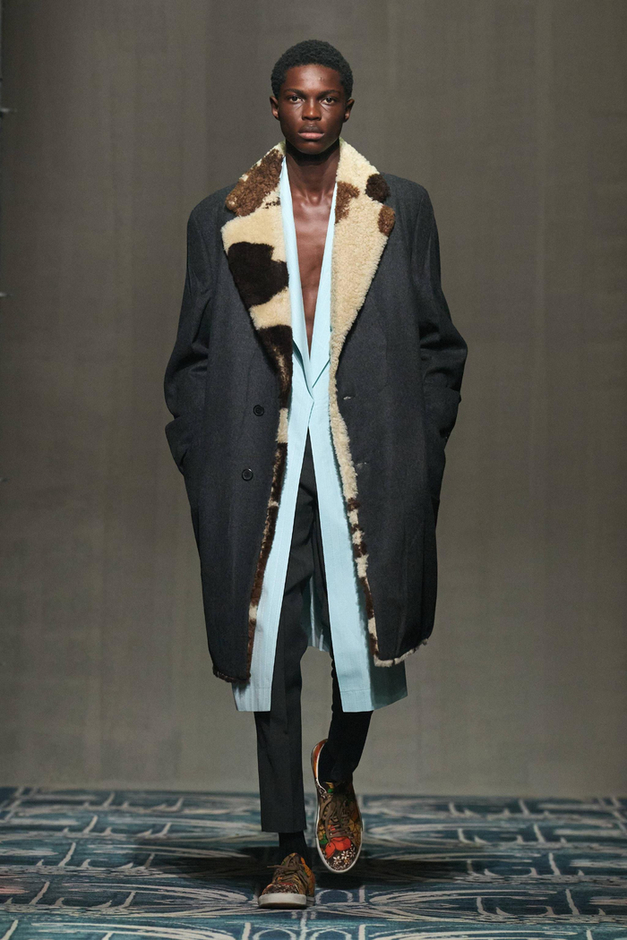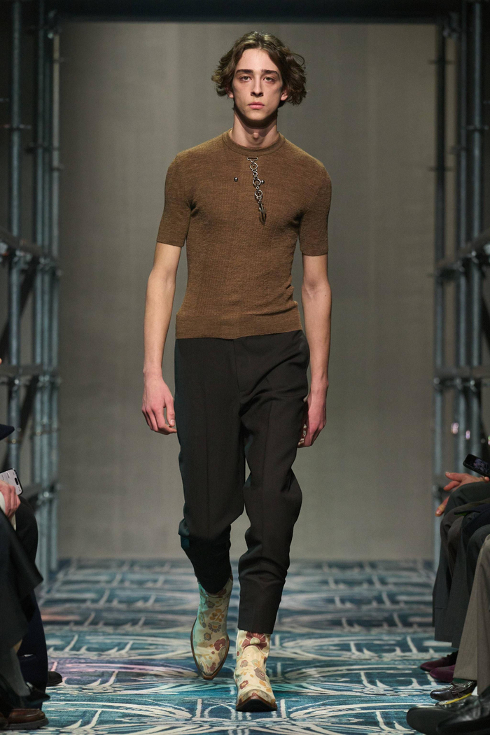 自然而即时的姿态反映了我们原始的人性。羊毛成为一种感官上的安全层,既可内穿,亦可外搭;针织衫则装饰着没有具体含义的金属符号,仿佛某种意义上的护身符,保护着我们。#米兰男装周#
