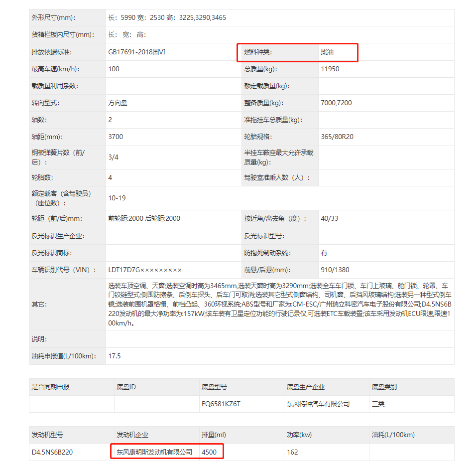 动力部分,新车搭载的是东风康明斯的4.5L柴油发动机,最大功率为165kw,满足国六排放标准,百公里综合油耗为17.5L,对于这辆自重达到7吨的大家伙来说这样的油耗值算是很不错了。