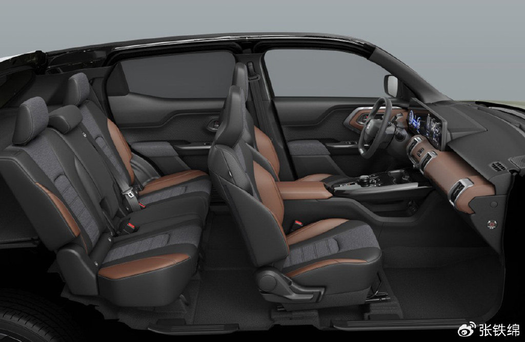 车身侧面也是很硬朗的硬派SUV设计风格,前后翼子板上部都使用了突出的折角式筋线造型,后排车窗底部上扬,车门把手放在了后窗框的位置,看上去很个性。突出的黑色轮眉和大面积的黑色车身下包围很粗犷硬朗,轮毂使用了低风阻设计。尺寸方面,新车的长宽高分别为4275/1800/1635mm,轴距2700mm。