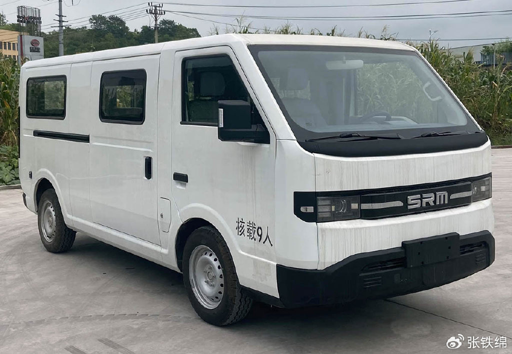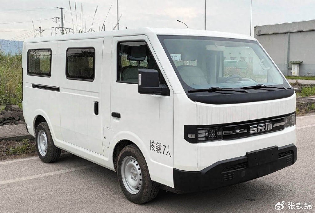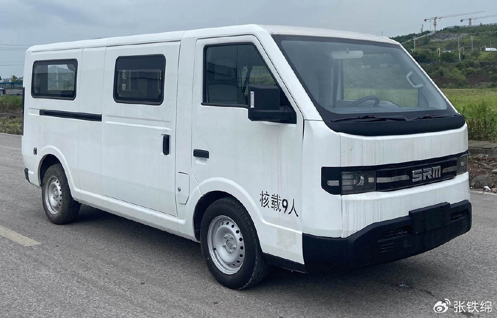 前脸部分,新车有着较大面积的前风挡玻璃,大灯造型很方正,外侧三组矩形光源结构,中间是带镀铬装饰的透镜光源,黑色的封闭式中网饰板上带有镀铬装饰,使用了SRM字母车标。前杠使用了黑色的涂装,也是很复古的风格。