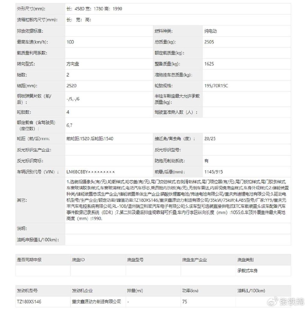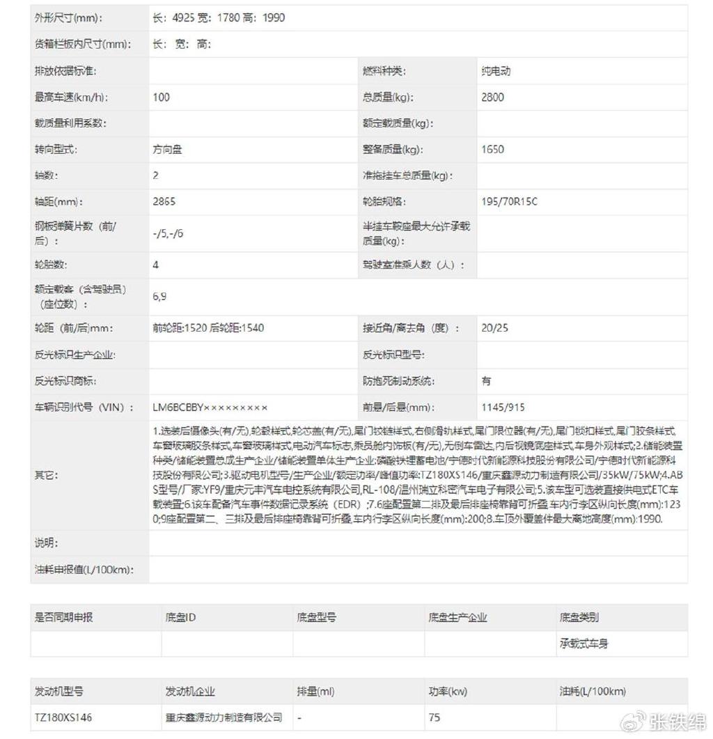 动力配置方面,此次申报的新款鑫源E3/E3L搭载的是最大功率均为75千瓦的电机,匹配的是来自比亚迪弗迪动力和宁德时代提供的磷酸铁锂电池,其申报的最高车速均为100公里/小时。