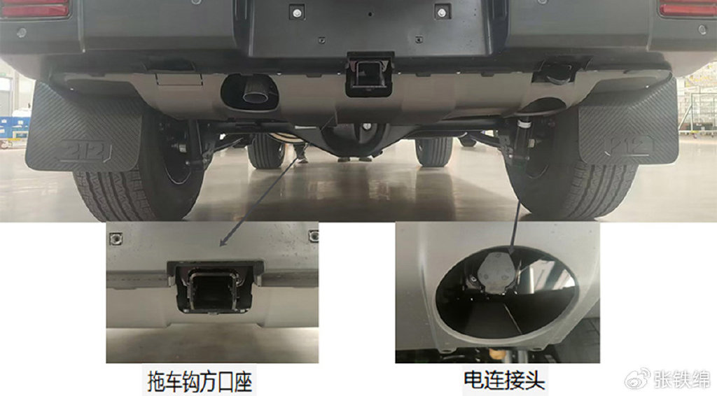 从申报信息来看,新车型会有天窗和不带天窗版本可选,另外还会有带拖挂资质的版本,后杠下部带有拖车装置以及电源接头,拖挂质量可达2.5吨。