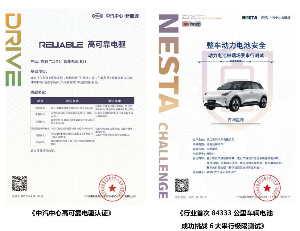 越级三电技术吉利星愿搭载行业首款11合1智能电驱,在功能高度集成的同时,拥有同级领先的89.2%电驱效率,实现同级最小的66L体积,将节省的空间以超大后备箱的形式还给了用户;通过了3000小时的台架耐久和200万公里的真实路试,星愿电驱完成了浸水工作、高温耐久、电磁抗扰、扭矩冲击、机械冲击等7大高难度挑战,获得了中汽研《高可靠电驱》的认证。