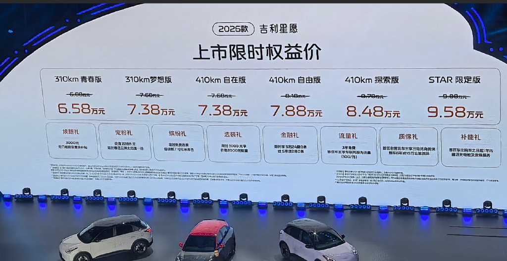 10月10日晚,吉利汽车在杭州举行“2025吉利汽车用户大会暨2026款吉利星愿上市发布会”,新车共推出6个版型,限时权益价6.58万–9.58万元。