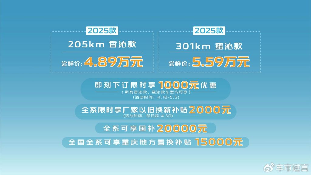 4月18日,长安汽车正式推出2025款Lumin(配置|询价)香沁款与蜜沁款,官方尝鲜价分别为4.89万元和5.59万元。用户可享最高2万元国补或1.5万元重庆地补,4月底前下订额外叠加2000元厂补,4月18日至5月5日期间下单还可享1000元现金优惠。多重补贴政策下,新车以“高配低价”策略强势切入市场,为消费者提供更具吸引力的购车选择。