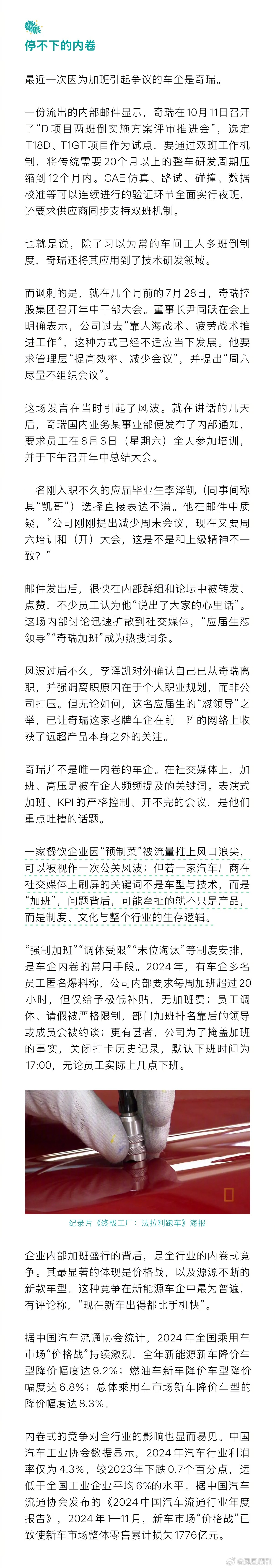 奇瑞并不是唯一内卷的车企。当互联网大厂昔日的荣光逐渐褪去,“996”“007”“大小周”也便转移到了汽车企业,尤其是新能源车企——毕竟它们才是这些年的新贵。表演式加班、KPI的严格控制、开不完的会议,是车企人重点吐槽的话题。