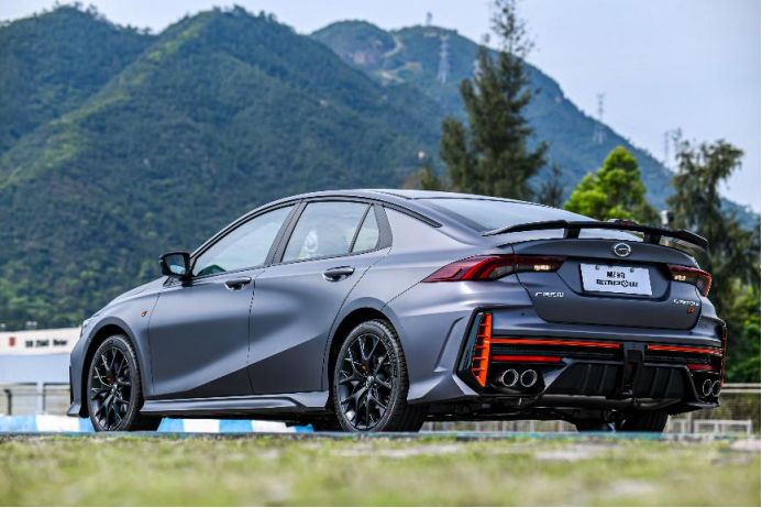 不仅仅如此,车身侧面也更有战斗气息,橙色卡钳搭配熏黑的18寸锻造运动轮圈,下包围也用到了和车身颜色相同的专属哑光灰,而轮胎也是采用了抓地力极强的米其林PS4,不过最让人上头的还是车尾的设计。