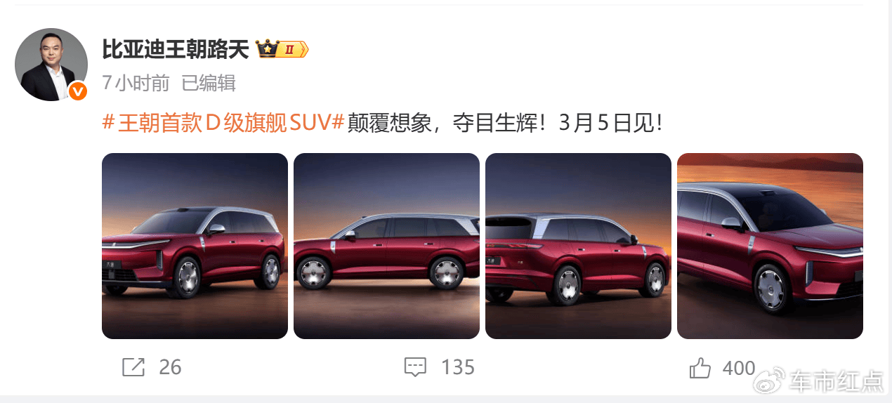 3月3日,比亚迪王朝网销售事业部总经理路天放出了一组官方车型图,正式官宣:王朝网首款D级旗舰SUV“大唐”将在3月5日亮相。