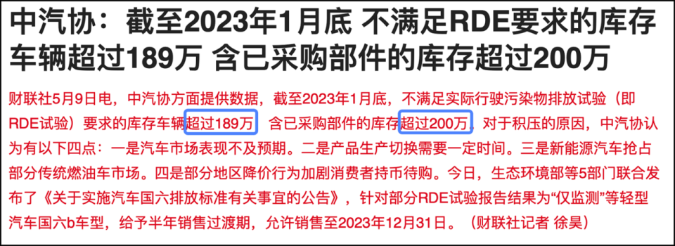 简单翻译成大白话,时间节点是7月1日,在这一天之后不是国六b标准的车辆将不能生产、进口和销售。而国内不满足国六b排放标准的燃油车,有数据显示超过百万辆。这上百万辆急需在这1个多月内售卖出去,否则很可能沦为不能上路的库存车。