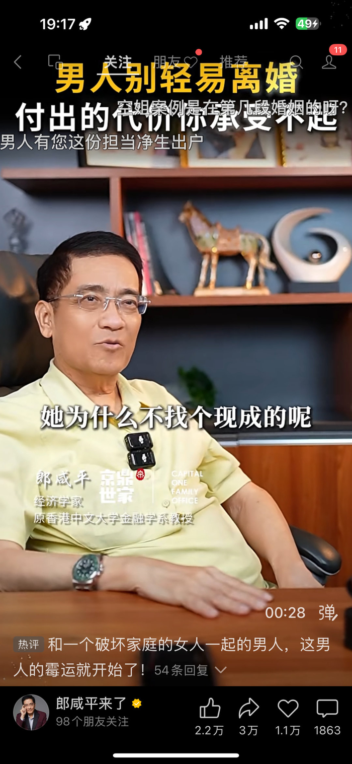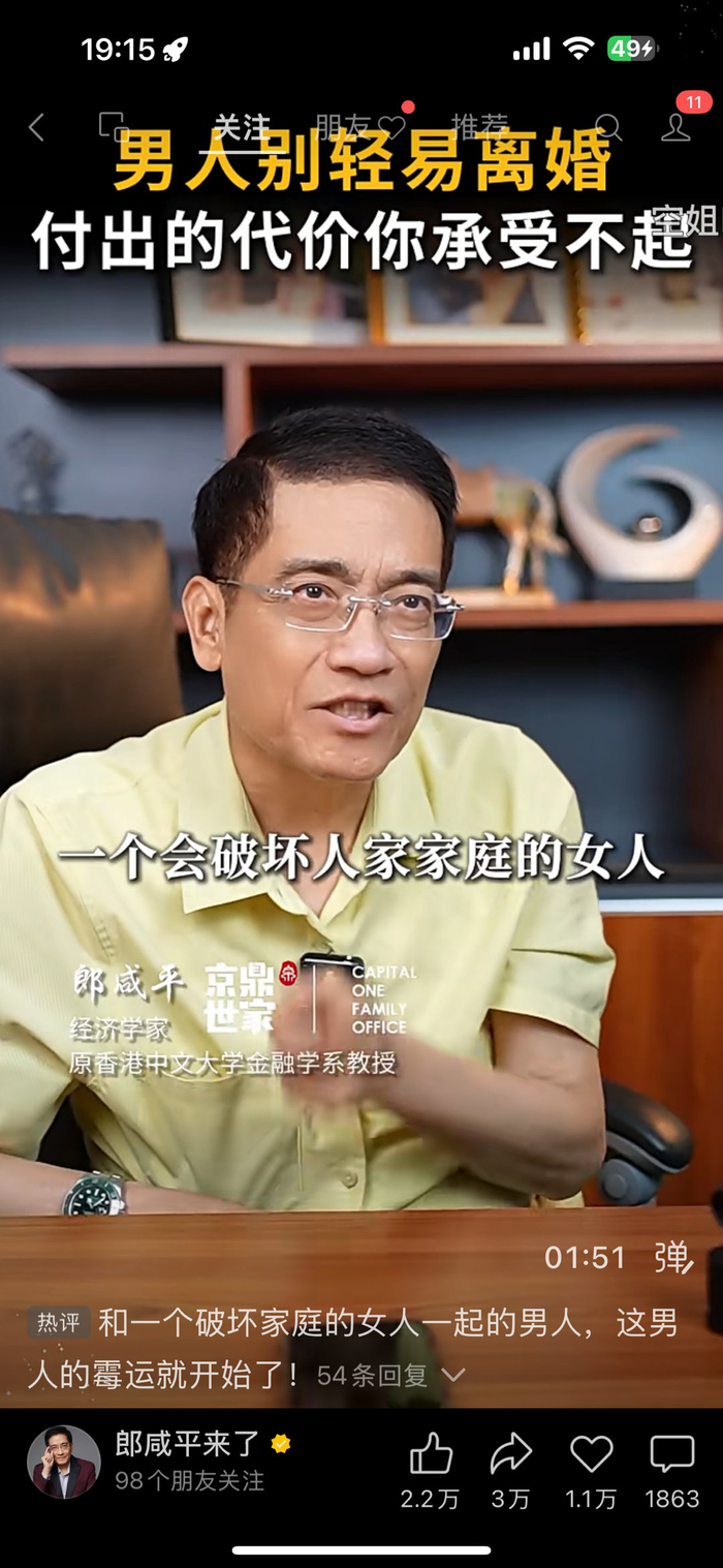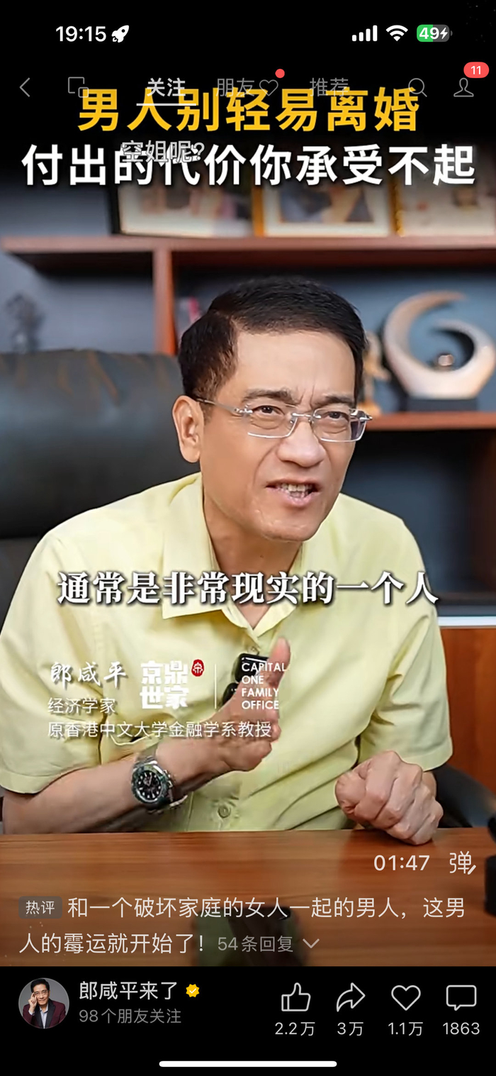 郎 咸平说,一个会破坏别人家庭的女人会是一个好女人吗?这种女人往往没有帮夫运,就是坐享其成的女人、看上的都是你的钱。