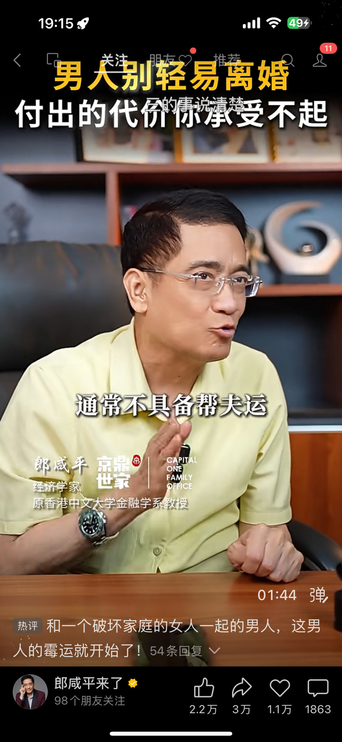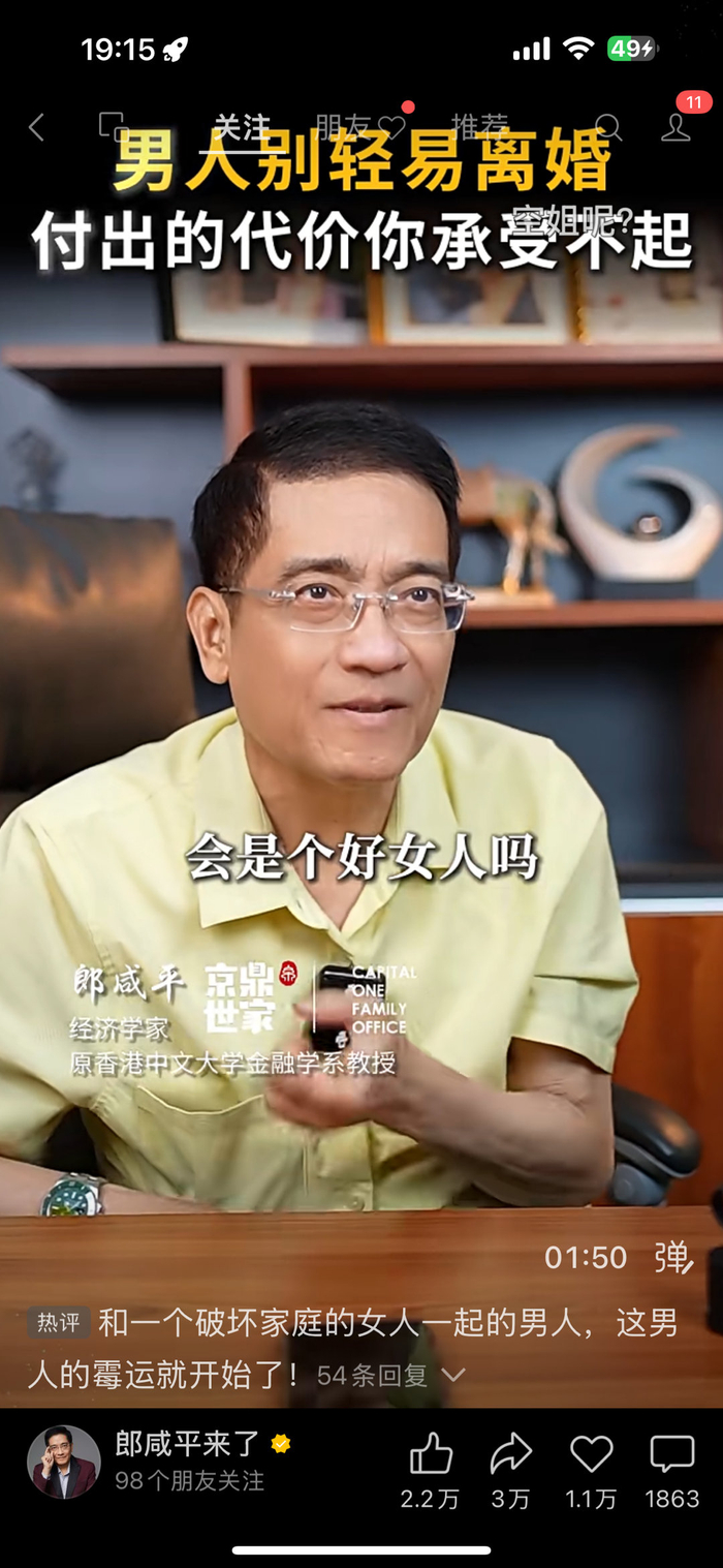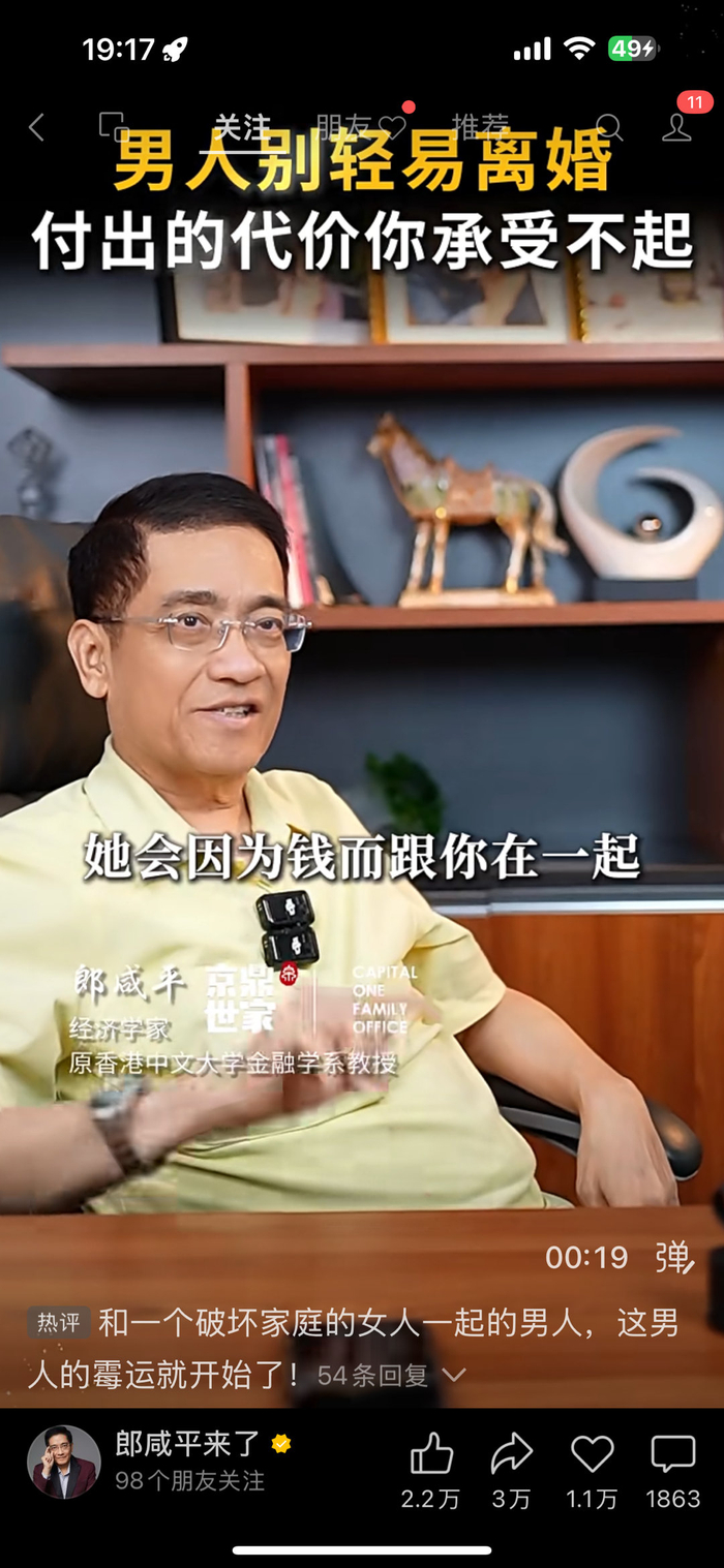 郎 咸平说,一个会破坏别人家庭的女人会是一个好女人吗?这种女人往往没有帮夫运,就是坐享其成的女人、看上的都是你的钱。