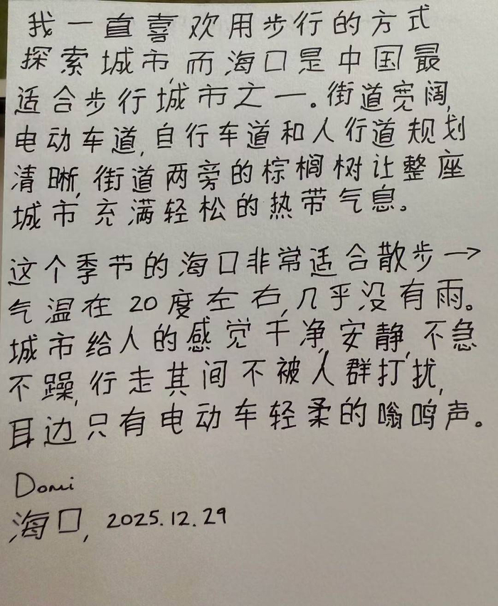 来自英国的Domi也提到,海南的街道规划清晰,适合步行,棕榈树和热带风情让城市显得轻松惬意,“这个季节的海口气温在20摄氏度左右,几乎没有雨,城市安静不躁,耳边只有电动车轻柔的嗡鸣声。”