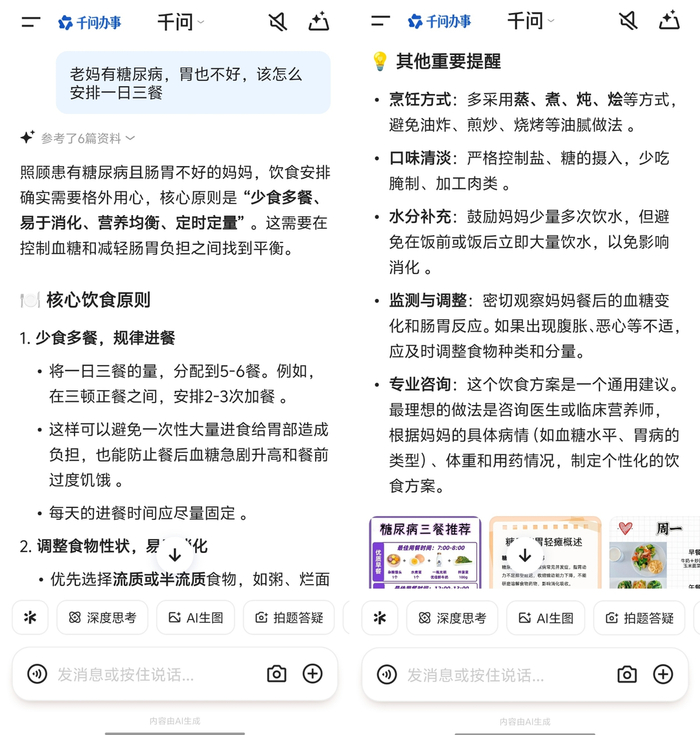 李阿姨今年68岁,糖尿病加上消化功能减弱,每天吃什么成了全家的难题。她儿子给她下载了一个AI应用,输入“老妈有糖尿病,胃也不好,该怎么安排一日三餐”,得到的回答让她儿子有点惊讶——不仅列出了饮食原则,还具体到“早餐可以把白粥换成杂粮粥加鸡蛋羹”“烹饪方式优先蒸煮炖”“蔬菜切细煮软”。