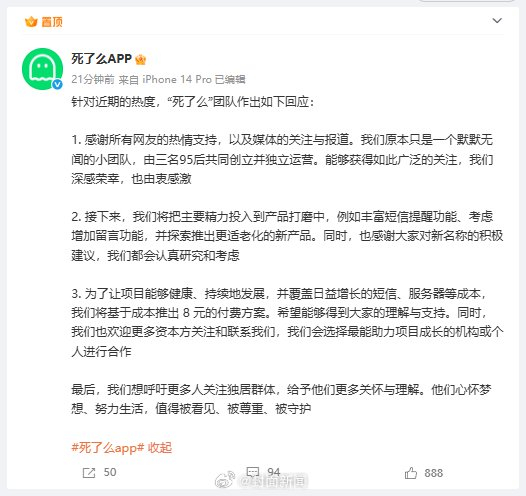 【#死了么APP再回应争议#:#死了么APP会持续打磨#】1月11日,@死了么APP 再发文,针对近期的热度,“死了么”团队作出如下回应: